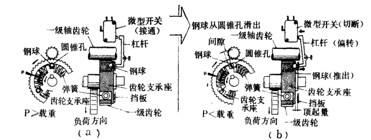 圖b為超負(fù)荷狀態(tài),符合扭矩超過彈簧力時(shí),二級(jí)軸齒輪和一級(jí)軸齒軸分離,鋼球從圓錐孔推出,擋板被頂出。擋板推動(dòng)杠桿偏轉(zhuǎn)時(shí),操作回路的微型開關(guān)切斷,停止運(yùn)轉(zhuǎn)。