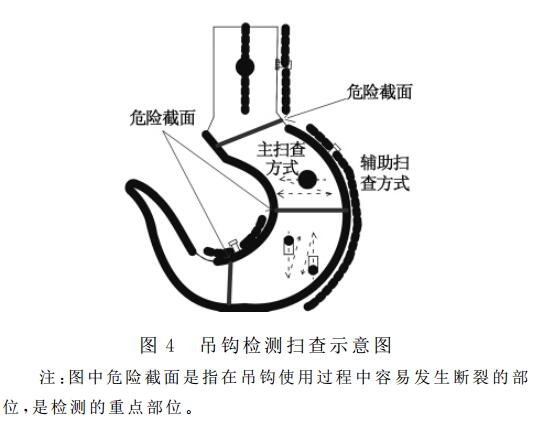 為防止缺陷漏檢,按圖4進行掃查直探頭采用接觸式在鉤柄圓柱、鉤腔、鉤腔外圓弧和鉤頭一側表面垂直于鍛造流線方向做鋸齒形掃查。掃描線按聲程1:1調節,以2平底孔為掃 查靈敏度,3平底孔為評定線靈敏度,耦合補償用試塊和工件實際測定。斜探頭在鉤頭兩側面沿鍛造流線方向做平行掃查和斜探頭在鉤腔內表面垂直于鍛造易折疊部位做鋸齒型掃查,掃描線速度按聲程1:1調節,靈敏度按2.4.3調節,耦合補償用試塊和工件實際測定。確因鍛件幾何形狀的限制而掃查不到的部位,應予以記錄和圖示,必要時還應得到各方同意。