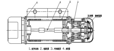 CD1型電動(dòng)葫蘆起升機(jī)構(gòu)采用錐形轉(zhuǎn)子電動(dòng)機(jī),它具有產(chǎn)生軸向磁拉力的特點(diǎn)。起動(dòng)時(shí),磁拉力克服彈簧壓力使轉(zhuǎn)子和與定子連成一體的風(fēng)扇制動(dòng)輪產(chǎn)生軸向位移,制動(dòng)輪剎車環(huán)與后端差脫開,轉(zhuǎn)子即在工作狀態(tài)下自由運(yùn)轉(zhuǎn),它通過中間軸裝置直接帶動(dòng)減速器的輸入軸轉(zhuǎn)動(dòng),經(jīng)過三級(jí)齒輪減速,由減速器的輸郵軸——空心軸驅(qū)動(dòng)卷筒轉(zhuǎn)動(dòng),纏繞鋼絲繩,使吊鉤升降。當(dāng)斷電后,磁拉力消失,在壓力彈簧的作用下,風(fēng)扇制動(dòng)輪與后端差剎緊,依靠剎車的磨擦力在瞬間獲得制動(dòng)作用,電動(dòng)葫蘆起升機(jī)構(gòu)不工作。