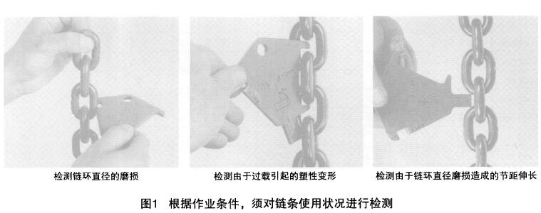 (3)檢查鏈環(huán)磨損及伸長:用生產(chǎn)廠商提供的標(biāo)牌進(jìn)行簡(jiǎn)單檢測(cè) (見圖1 ) 。