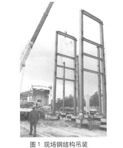 吊車選擇:現(xiàn)場鋼結(jié)構(gòu)吊裝時,成片鋼結(jié)構(gòu)常采用一機主吊、一機抬吊法進(jìn)行吊裝,立柱常采用單機旋轉(zhuǎn)法進(jìn)行吊裝。由于成片鋼結(jié)構(gòu)整體重量重于10t,高度在20m以上,吊點一般設(shè)置在頂部橫梁處,雙吊點吊裝。所以根據(jù)情況考慮負(fù)載、地面脫鉤,在吊裝過程中選用大噸位、長臂吊車。且吊索高度應(yīng)與立柱或者鋼結(jié)構(gòu)高度一致,吊車吊裝高度至少為鋼結(jié)構(gòu)高度的一倍。
