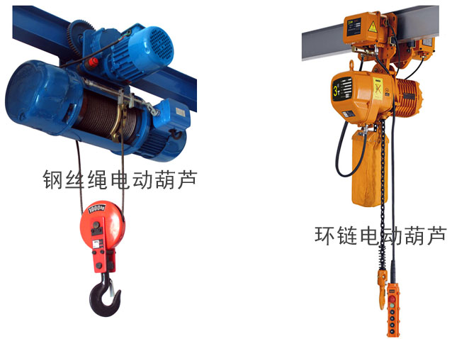 電動葫蘆按其結構形式可分為環鏈電動葫蘆和鋼絲繩式電動葫蘆。環鏈式電動葫蘆是用環狀焊接鏈與吊鉤連接作起吊索具之用。因起升高度較低,廣泛用于低矮廠房或露天環境。而鋼絲繩電動葫蘆是用鋼絲繩與串鉤連接作起吊索具之用。