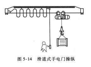 3、滑道式手電門操縱,如圖5-14所示。這種操縱方式可根據操作人員的實際需要,自由地掌握與吊載的遠近,既安全又方便,是較好的地面操作方式之一。