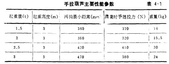 手扳葫蘆比手拉葫蘆及環鏈電動葫蘆都輕巧。一般手拉葫蘆的安全系數n=2,但手扳葫蘆的安全系數廠家提供n》5。手扳葫蘆的另一有點是提升的高度不受限制,鋼絲繩的長度可作調整。圖4-51為手扳葫蘆外形,表4-3列出手扳葫蘆的主要性能。