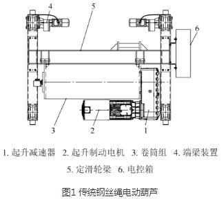 該設備與傳統鋼絲繩電動葫蘆相比較,其主要構成部件較為相似,由起升制動電機、起升減速器、卷筒組、定滑輪梁、端梁裝置和電控箱等組成。