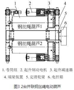 為滿足岸橋上檢修橋機大起升高度的需要,起升高度達到63m,以往的設計大多采用2臺10t鋼絲繩電動葫蘆并聯抬吊的形式,其布置方式如圖3所示,鋼絲繩纏繞形式如圖4所示。由于2臺電動葫蘆并聯抬吊,造成電動葫蘆小車的基距增大,從而造成維修起重機的小車工作盲區加大,這就意味著岸橋的整個機房必須加大,進一步造成岸橋的成本增加,而且無法很好地滿足檢修、維修工作。
