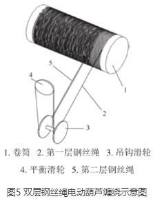 采用4/2倍率繞繩方式,由于第一層鋼絲繩與第二層鋼絲繩在卷筒上有高低差(即鋼絲繩直徑差),卷筒轉動時,上下兩層鋼絲繩進出繩速度會不一致,因此,通過增加一個平衡滑輪,調整繩速,使起吊平穩,解決了以往2臺電動葫蘆并聯時容易出現的出繩和入繩不同步的現象,提高了鋼絲繩電動葫蘆的使用壽命。