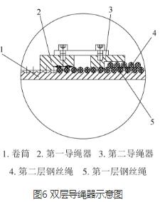 采用單根鋼絲繩雙層同向纏繞的方式:鋼絲繩兩端分別固定于卷筒的同一端部,鋼絲繩的一端在卷筒上卷繞形成第一層鋼絲繩,鋼絲繩的另一端在卷筒與第一層鋼絲繩上卷繞形成第二層鋼絲繩。同時卷筒上安裝有防止第一層鋼絲繩亂繩的第一導繩器,第一層鋼絲繩上安裝有防止第二層鋼絲繩亂繩的第二導繩器,2個導繩器之間向固定連接,如圖6所示。運行時,第一導繩器與第二導繩器同時工作,向相同方向移動,從而實現兩層鋼絲繩能同時卷繞或釋放,進而實現在電動葫蘆體積不變的情況下,起升高度幾乎是原電動葫蘆的2倍,大大提高了電動葫蘆的起升高度。