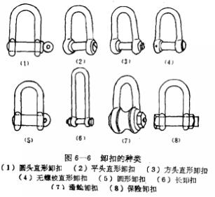 1、圓頭卸扣:這種卸扣的銷的端部,有一種圓形的銷柄(圖6-6),不用器械科徒手加一扣合合卸脫,使用較為方便,故在漁具上普遍使用。如漁船船尾的拽引裝置與拽崗的連接,水上部分構件件的連接均用此類卸扣。但該卸扣不宜用于拽綱間的連接,以免在放絞拽綱時,突出的銷柄與其他屬具發生掛鉤。圓頭卸扣的銷柄環眼處,可貫穿保險鉛絲與卸扣本體縛住,以防止栓的脫落。為防止生銹和便于卸脫,在其螺紋部分需涂以牛油。