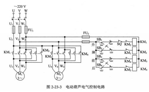 如圖2-23-3所示為電動葫蘆電氣控制電路圖。提升電動機M1由上升、下降接觸器KM1、KM2控制,移動電動機M2由向前、向后接觸器KM3、KM4控制。它們都由電動葫蘆懸掛按鈕站上復式按鈕SB1-SB4實現電動控制,SQ為提升行程開關。