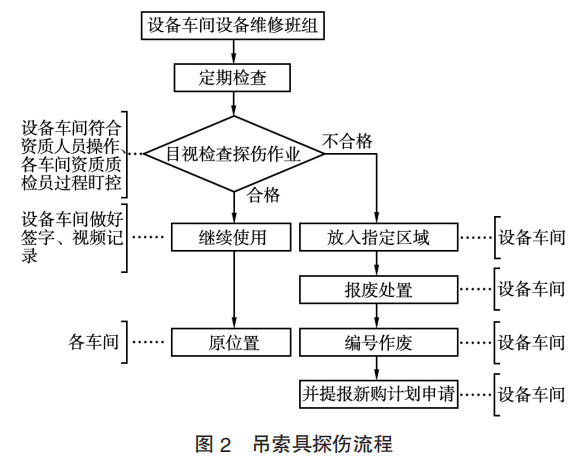 由設備車間定期進行檢查檢測,經過探傷后合格的吊索具交由原車間繼續使用,并做好相關視頻和紙質記錄;對檢測不合格的,要放入指定區域,集中報廢處置并做好記錄,同時啟動新購流程。