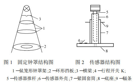 傳感器外殼固定在套筒上,底座則與套筒固定在一起、三者連為一體。設置環形擋板和輻條是因為在電動葫蘆制動后,底座和重物砣由于受到自身重力的作用,必然要下滑一段距離,當底座下滑到傳感器推桿端部時,輻條碰住環形擋板上表面,底座停止下滑,這樣可避免將推桿從傳感器外殼中拉出。同時,環形擋板還起著在底座上升時閉合行程開關的作用。因此,環形擋板和輻條的安放位置十分關鍵。環形擋板的位置應保證在測試過程中重物饦推動底座上升到行程開關碰住環形擋板底部時,傳感器端部與底座之間仍有一微小距離,這樣就防止了底座撞擊傳感器端部而損壞傳感器。輻條的位置應保證底座下滑到碰到環形擋板時,推桿剛好到達傳感器大位置且未從外殼中拉出。