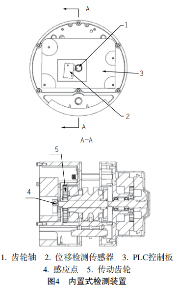 內(nèi)置式高度檢測裝置如圖4所示,它主要由齒輪軸、位移檢測傳感器和PLC控制板組成。齒輪軸位于電動葫蘆內(nèi),齒輪軸貫穿PLC控制板,PLC控制板上設(shè)有位移檢測傳感器,位移檢測傳感器位于齒輪軸旁,PLC控制板與位移檢測傳感器電連接,齒輪軸上設(shè)有感應(yīng)點(diǎn),感應(yīng)點(diǎn)與位移檢測傳感器配合。根據(jù)不同葫蘆的結(jié)構(gòu),在葫蘆電機(jī)的齒輪軸上,布置一個凸起或凹陷的感應(yīng)開關(guān)感應(yīng)點(diǎn)用于檢測該軸的轉(zhuǎn)動圈數(shù)。電動葫蘆必須配置控制的PLC或單片機(jī),用于處理感應(yīng)開關(guān)檢測到軸的轉(zhuǎn)動圈數(shù)。每臺環(huán)鏈電動葫蘆會根據(jù)實(shí)際鏈條長度,預(yù)先在程序中設(shè)定好鏈條的首位限位點(diǎn)。PLC或單片機(jī)程序設(shè)定好檢測的軸與起重鏈條運(yùn)行距離的比例,再根據(jù)檢測軸轉(zhuǎn)動的圈數(shù)計(jì)算出鏈條運(yùn)行的距離,實(shí)時計(jì)算出吊鉤的高度,當(dāng)鏈條運(yùn)行到限位點(diǎn)時會自動停機(jī),起到限位的作用。