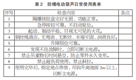 電纜滑車的滾輪材料:防爆電動葫蘆電纜滑車的滾輪使用工程塑料材料,避免因摩擦產(chǎn)生火花。防爆電動葫蘆使用:按照防爆電動葫蘆日常使用表單(見表 2)進(jìn)行檢查和使用,確保了安全生產(chǎn)。