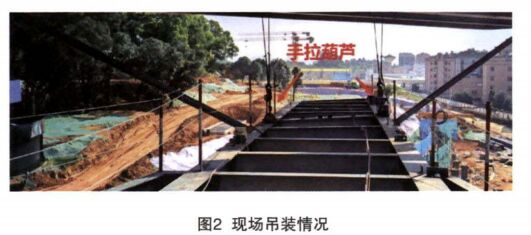 (4)吊裝工具進場驗收。手拉葫蘆是主要的吊裝工具,手拉葫蘆進場前,復核葫蘆的額定起重量是否滿足要求,查驗相關的合格證和檢驗報告。本項目吊裝的懸挑結構單根主梁最大重量11t,考慮一端固定一端懸挑,懸挑端采用額定起重量為10t的手拉葫蘆可以滿足要求。驗收進場的鋼絲繩直徑是否符合方案的要求,是否有起毛、斷絲、磨損的情況。如果有異常,驗收卸扣規格尺寸等能否滿足吊裝要求用。