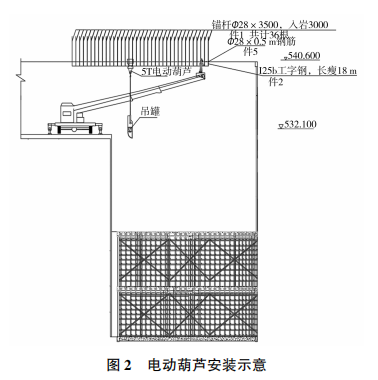 在抽水蓄能電站地下廠房土建及機電設備安裝施工過程中,因施工場地空間受限,導致材料垂直運輸通道單一影響現場施工進度。為解決此類問題,利用電動葫蘆具有體積小、自重輕、操作簡單、使用方便等特點,采用在副廠房頂拱巖體位置安裝電動葫蘆、副廠房各樓層預留吊物孔的方式,形成副廠房臨時垂直運輸通道,滿足土建施工期模板、腳手架。機電設備安裝期空壓機氣罐、電氣盤柜等材料設備的轉運,有效利用現場施工空間。從而達到提升施工效率、降低現場施工強度及節約施工成本的目的。