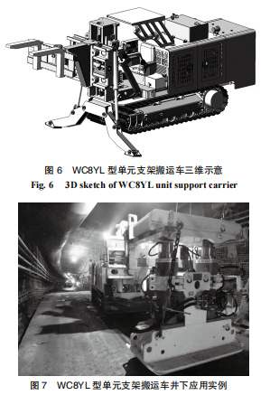 為提高單元支架的搬運(yùn)效率,聯(lián)合專業(yè)廠家研發(fā)了 WC8YL 型單元支架專用搬運(yùn)車,并已在神東集團(tuán)錦界煤礦、新汶集團(tuán)內(nèi)蒙能源長(zhǎng)城三礦、陜西麟北煤業(yè)園子溝煤礦等多家煤業(yè)公司成功應(yīng)用。WC8YL 型單元支架搬運(yùn)車三維示意及井下應(yīng)用實(shí)例如圖 6、7 所示。