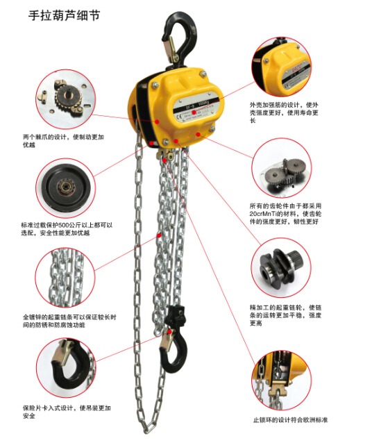 1、 懸掛裝置和載重吊鉤由抗老化、高強(qiáng)度合金鋼制成,當(dāng)萬一出現(xiàn)超載的情況下會首先發(fā)生變形而不會突然斷裂。